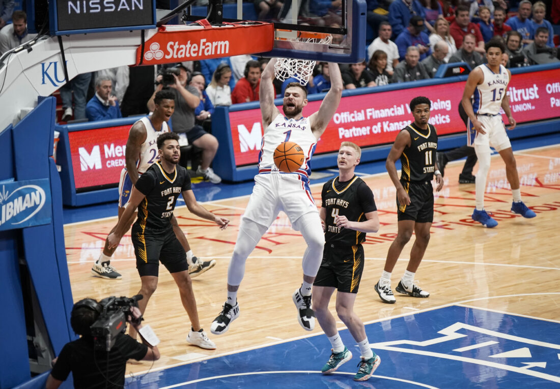 Kansas center Hunter Dickinson (1) delivers a dunk against Fort Hays State on the first play of the game during the first half on Wednesday, Nov. 1, 2023 at Allen Fieldhouse. Photo by Nick Krug