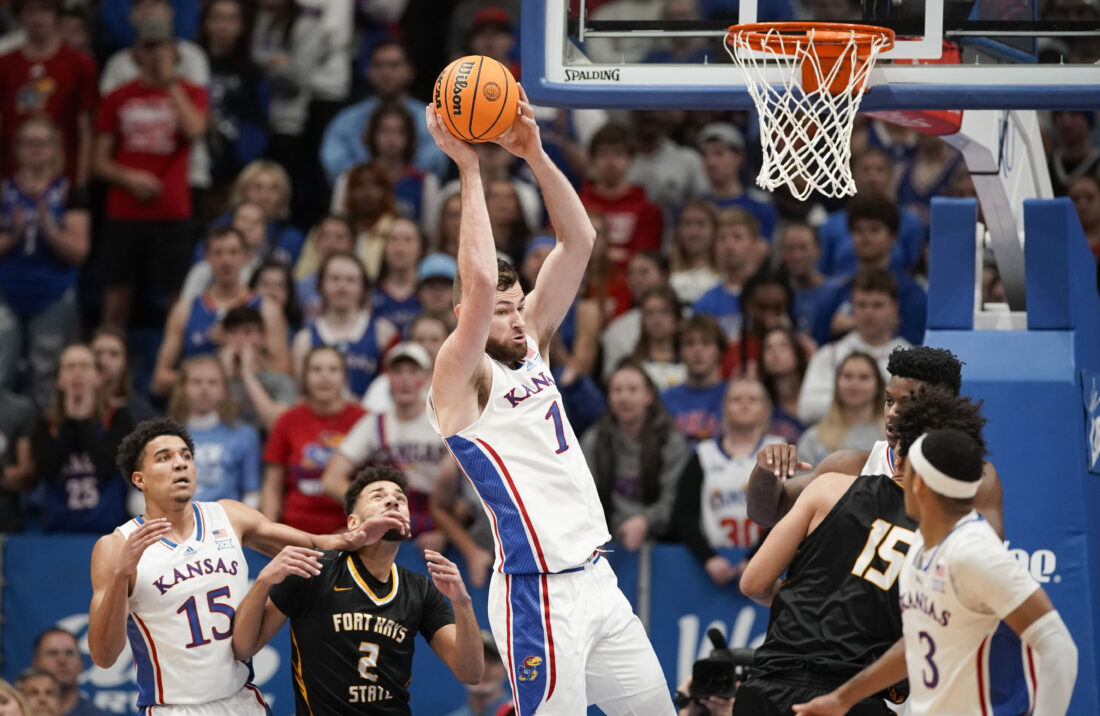 Kansas center Hunter Dickinson (1) pulls down a rebound against Fort Hays State during the first half on Wednesday, Nov. 1, 2023 at Allen Fieldhouse. Photo by Nick Krug