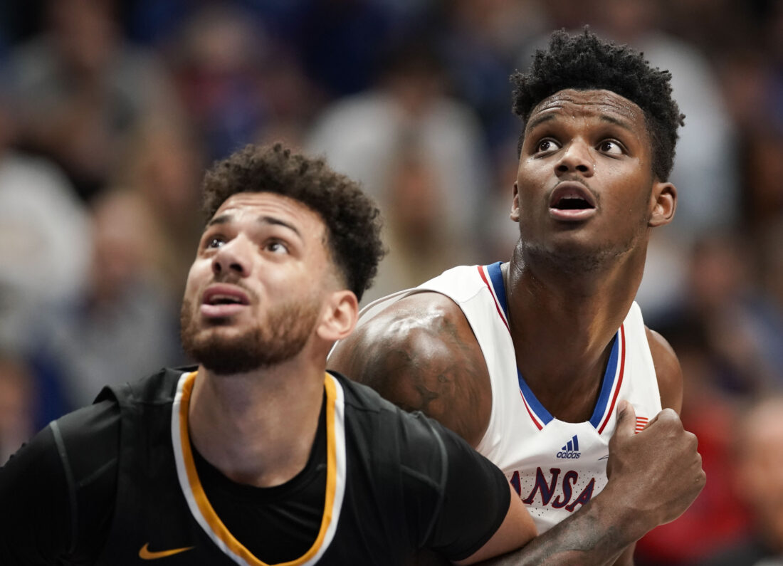 Kansas forward K.J. Adams Jr. (24) works for position against Fort Hays State guard Traejon Davis (2) during the first half on Wednesday, Nov. 1, 2023 at Allen Fieldhouse. Photo by Nick Krug