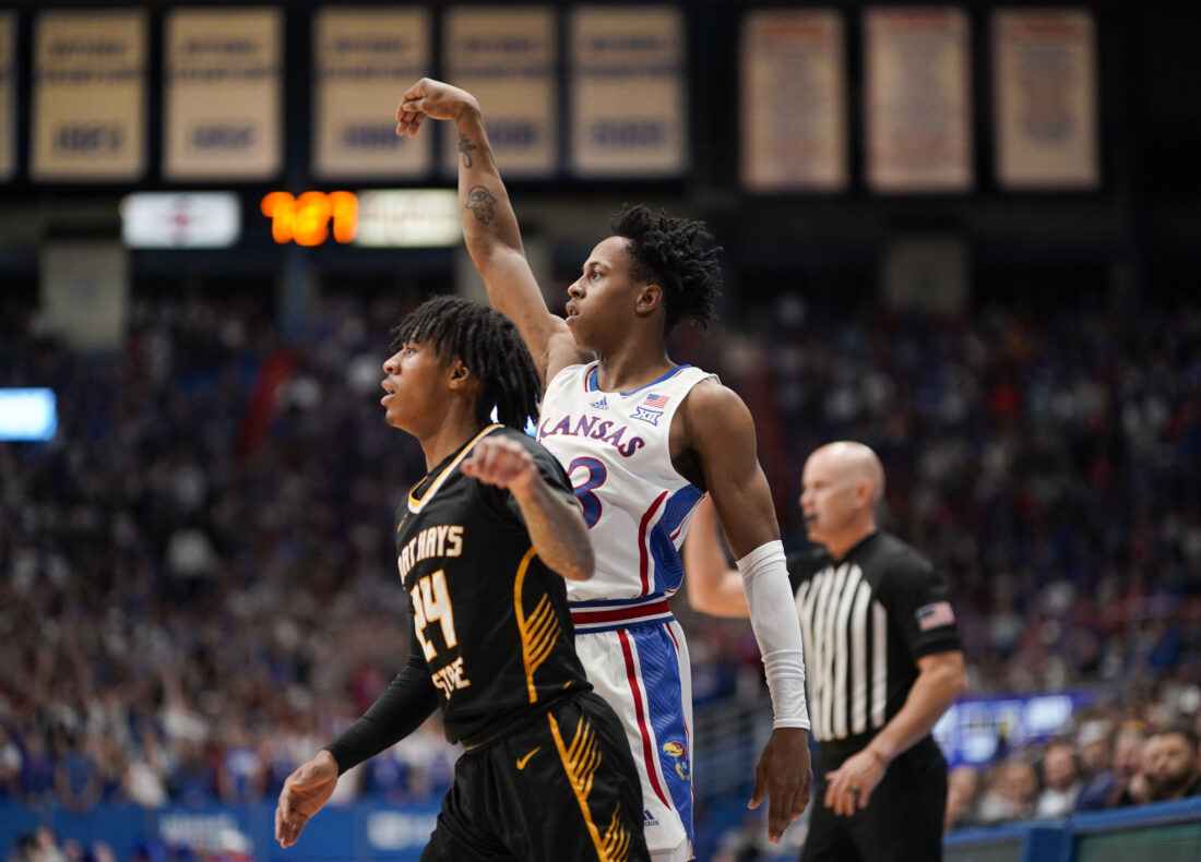 Kansas guard Elmarko Jackson (13) hangs his hand after a putting up a three over Fort Hays State guard Jaheim Holden (24) during the first half on Wednesday, Nov. 1, 2023 at Allen Fieldhouse. Photo by Nick Krug