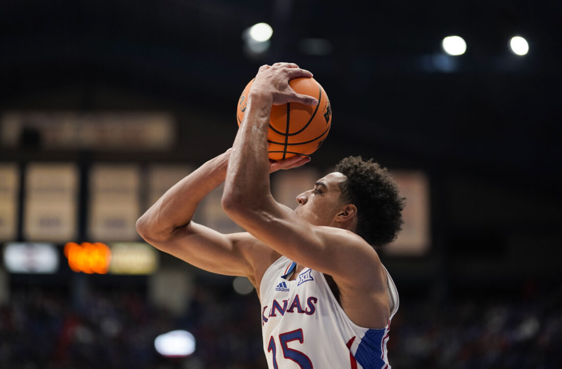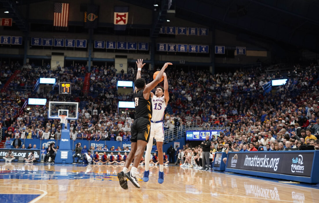 Kansas guard Kevin McCullar Jr. (15) lines up a three during the first half on Wednesday, Nov. 1, 2023 at Allen Fieldhouse. Photo by Nick Krug