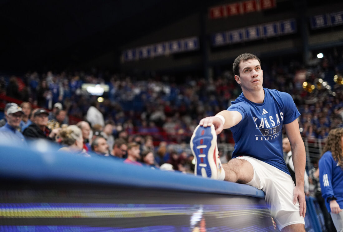 Kansas guard Nicolas Timberlake (25) gets stretched out along the sidelines before tipoff on Wednesday, Nov. 1, 2023 at Allen Fieldhouse. Photo by Nick Krug