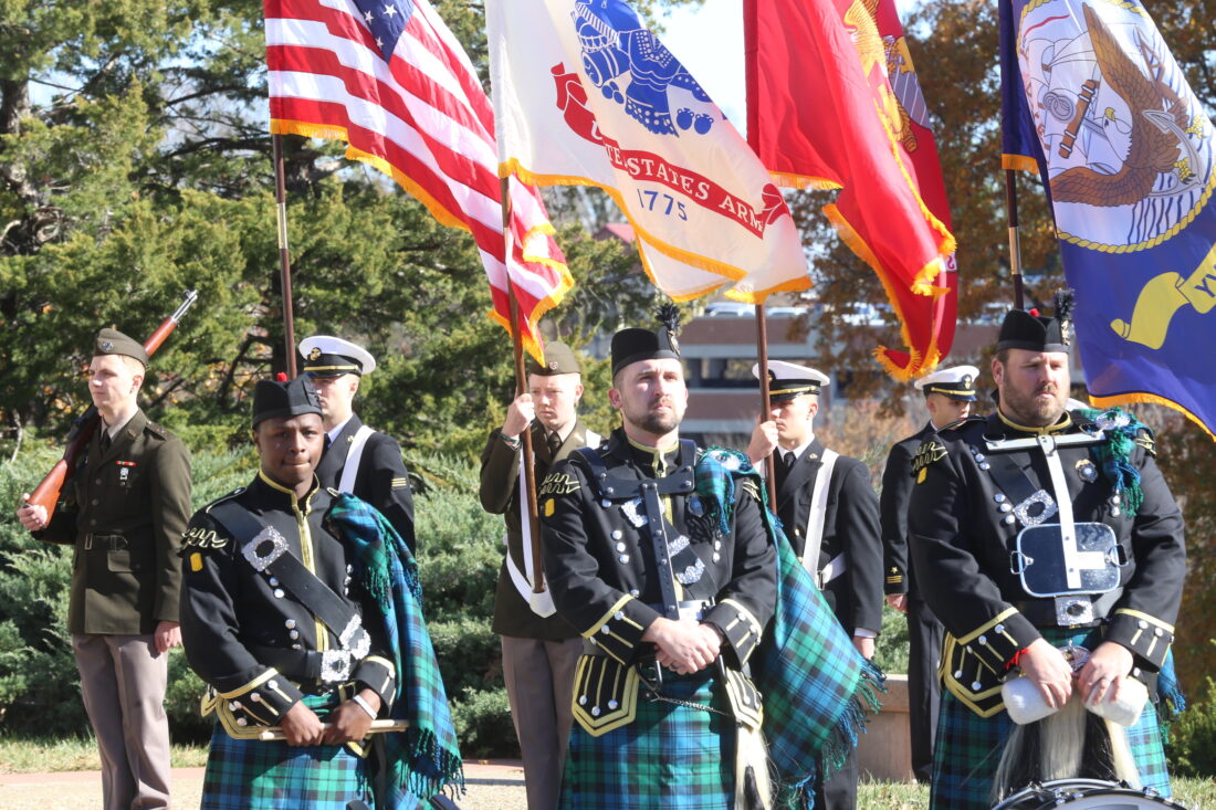 The Kansas City, Kansas, Police Department Pipe & Drum Band and the KU ROTC Color Guard both took part in ceremonies at KU’s Veterans Day event on Nov. 10, 2023.