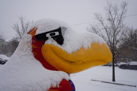 A Jayhawk sits covered in snow in downtown Lawrence on Monday, Dec. 1, 2025.