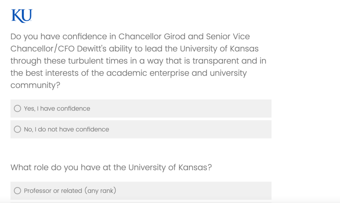 A screenshot from an online survey asking people connected with KU to vote on whether they have confidence in the KU chancellor and the university’s chief financial officer.