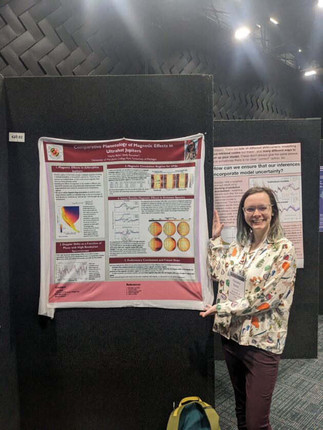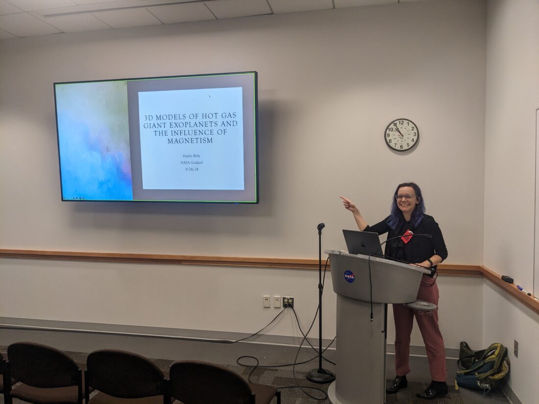 Hayley Beltz presenting her research on the impact of magnetic fields on a type of exoplanets known as “Ultrahot Jupiters.” Beltz, who recently won the prestigious NASA Hubble Prize Fellowship, is a researcher at KU, and she will spend the next three years at the school expanding her research opportunities and aiming to mentor students.