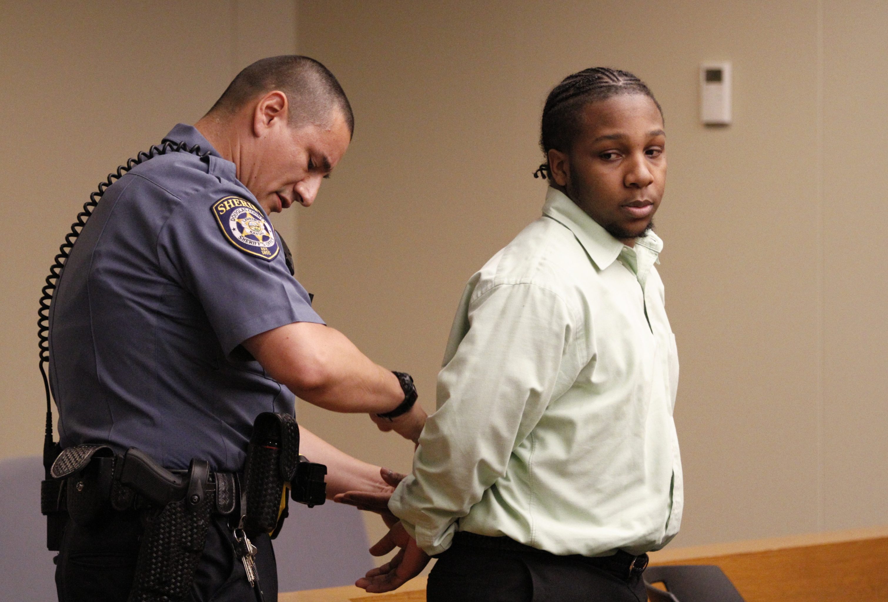 Shawn K. Smith, of Kansas City, Mo., is handcuffed on Monday, Aug. 27, 2018, after a trial in Douglas County District Court. Jurors convicted Smith’s two co-defendants of voluntary manslaughter but couldn’t agree on a verdict for Smith, causing the judge to declare a mistrial in his case. Smith and the others originally were charged with murder stemming from a triple shooting that killed Cameron Hooks, 23, of Lenexa, on Sept. 2, 2017, at Motel 6 in North Lawrence.