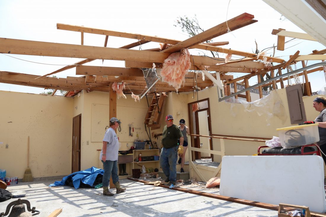 In what used to be the garage, relatives and friends of Cherry McCabria, 88, work on Friday, May 31, 2019, to clean up the property after a tornado destroyed McCabria’s home of more than 40 years at 1455 E. 1900 Road, northwest of Eudora. McCabria, who went to the basement before the twister hit, wasn’t injured.