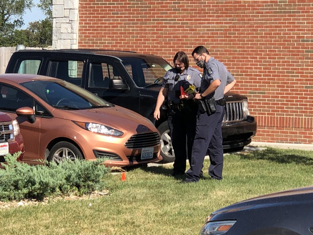 Officers lay down an orange cone in an area between Truity Credit Union and Casey’s convenience store on 31st Street in southern Lawrence on Tuesday, Sept. 21, 2021. Officers were responding to a reported robbery at the bank.