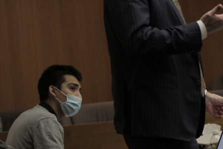 Alejandro Martinez-Diaz appears in Douglas County District Court on Tuesday, April 12, 2022, during the first day of his jury trial for attempted first-degree murder. The trial has been delayed pending resolution of an appealed order in the case.