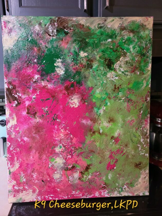 A painting created by Cheeseburger, a patrol service dog with the Lawrence Police Department. Cheeseburger’s handler is Officer Matt Weidl.