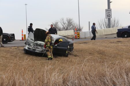Police pursued the vehicle through Old West Lawrence and the downtown area before turning north. In North Lawrence, Douglas County sheriff’s deputies joined the chase. They deemed the speeding vehicle a threat to public safety and performed a tactical maneuver in the 1100 block of North Third Street, said George Diepenbrock, a spokesman for the Douglas County Sheriff’s Office. The car came to rest in the grass near the on-ramp to the Kansas Turnpike. The vehicle was briefly on fire, but it appeared that the flames were quickly extinguished. The turnpike booth remained open to traffic.