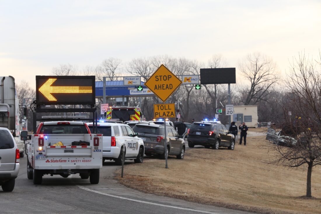 Police and emergency vehicles are pictured at the scene Thursday near the entrance to the Kansas Turnpike.