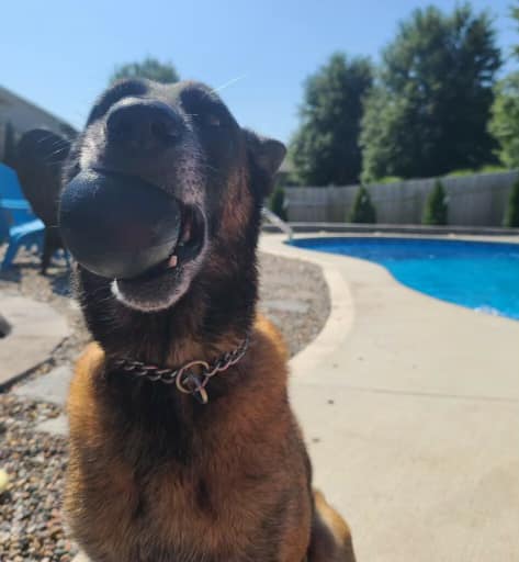 Retired Patrol Service Dog, Deuce, playing poolside.