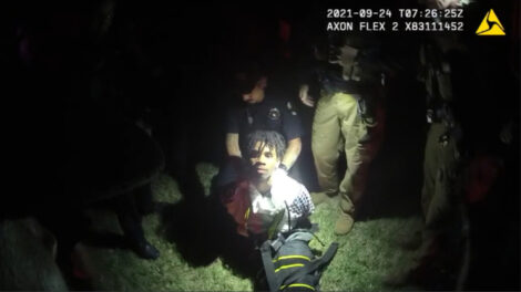 In this image from body camera video provided by Sedgwick County, police put Cedric “C.J.” Lofton, 17, into a body-length restraining device called a WRAP outside his home in Wichita on Sept. 24, 2021. His foster father, unable to deal with a teen who seemed to be in the throes of schizophrenia, had called Wichita police.