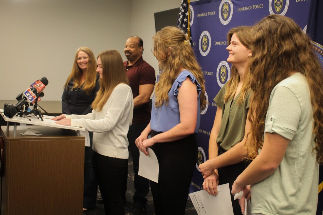 Ashlyn Gibbs, Regan Gibbs’ younger sister, shares a memory of her sister Regan Gibbs on Friday, May 20, 2022, at a news conference at Lawrence Police Department Headquarters. Regan was killed early this week, and her significant other, Chad Marek, is facing first-degree murder charges.