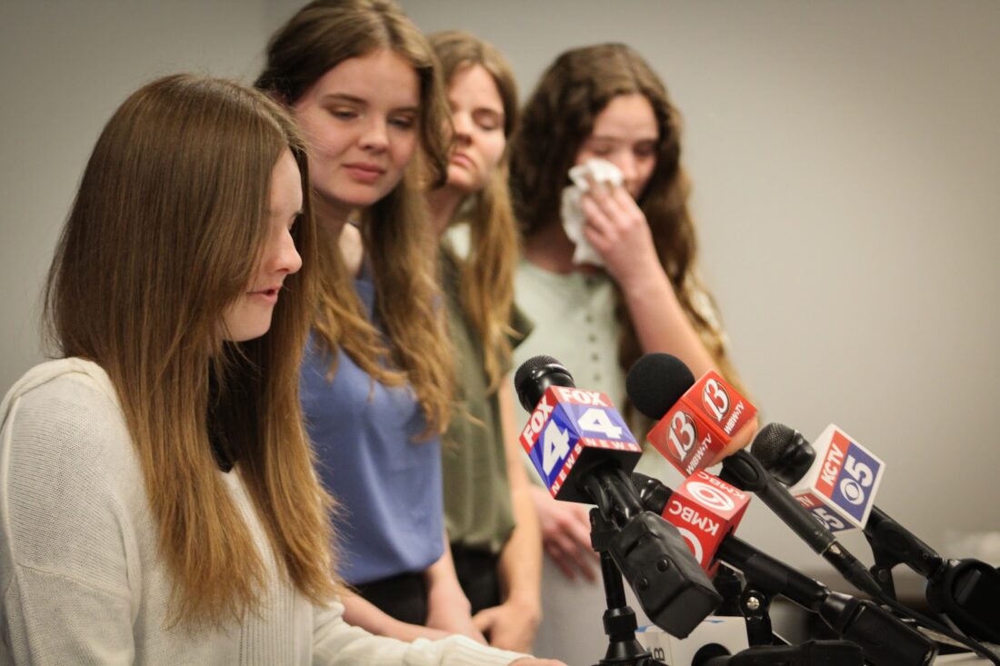 Kristin Gibbs, left, and her daughters Ashlyn, Madelyn, Erin and Kearan Gibbs spoke Friday, May 20, 2022, about their daughter and sister, Regan Gibbs, at a news conference at Lawrence Police Department Headquarters. Regan was killed early this week, and her significant other, Chad Marek, is facing first-degree murder charges.