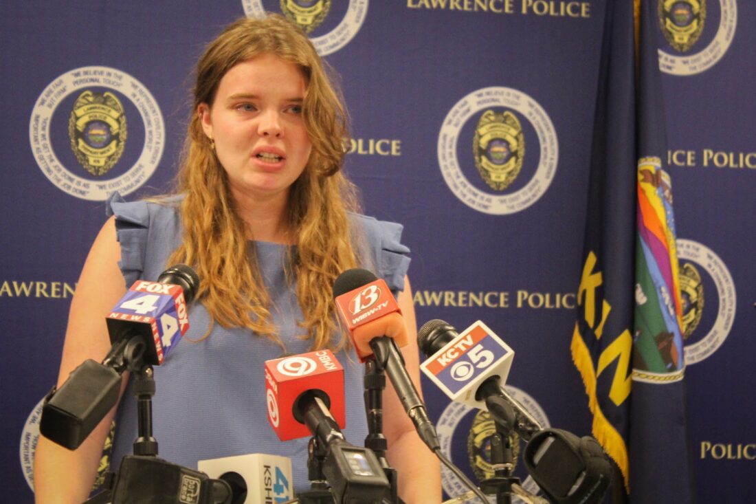 Kearan Gibbs, Regan Gibbs’ younger sister, shares a memory of Regan on Friday, May 20, 2022, at a news conference at Lawrence Police Department Headquarters. Regan was killed early this week, and her significant other, Chad Marek, is facing first-degree murder charges.