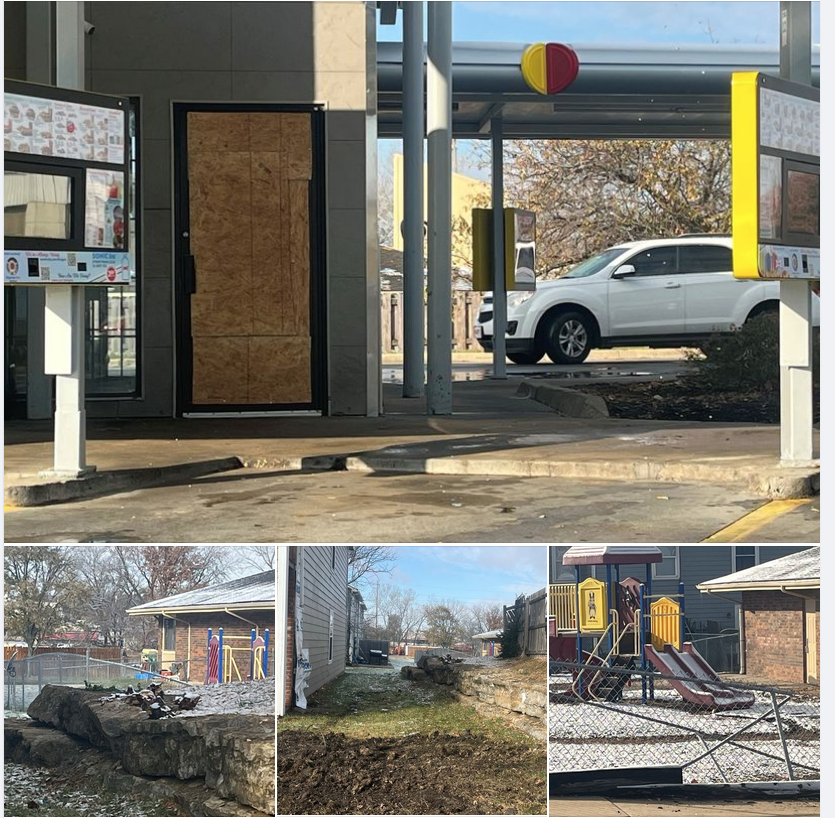 The vehicle struck the Sonic building, 3201 W. Sixth St., then reversed and struck a fenced-in garbage area, police said on social media. The driver then proceeded forward, drove over a retaining wall and through two chain-link fences. He ended up in the playground of La Petite Academy, damaging some of the equipment, then went over another retaining wall and eventually came to rest against an apartment building’s wall, damaging its gas meter.