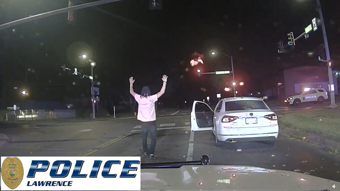Lawrence police released a video of an incident in which a gun was fired at people from a moving vehicle. In this screenshot from the video, the driver of the vehicle can be seen moments before his arrest.