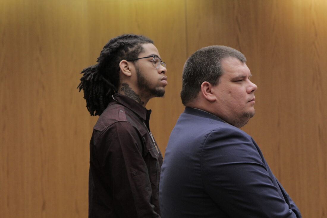 Treyvon D. Johnson, left, and his defense attorney Joseph Falls during a sentencing hearing in Douglas County District Court on April 24, 2023. Johnson was convicted of two counts of aggravated assault for firing a gun at two pedestrians in downtown Lawrence.