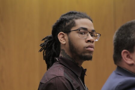 Treyvon D. Johnson is pictured during a sentencing hearing in Douglas County District Court on April 24, 2023. Johnson was convicted of two counts of aggravated assault for firing a gun at two pedestrians in downtown Lawrence.