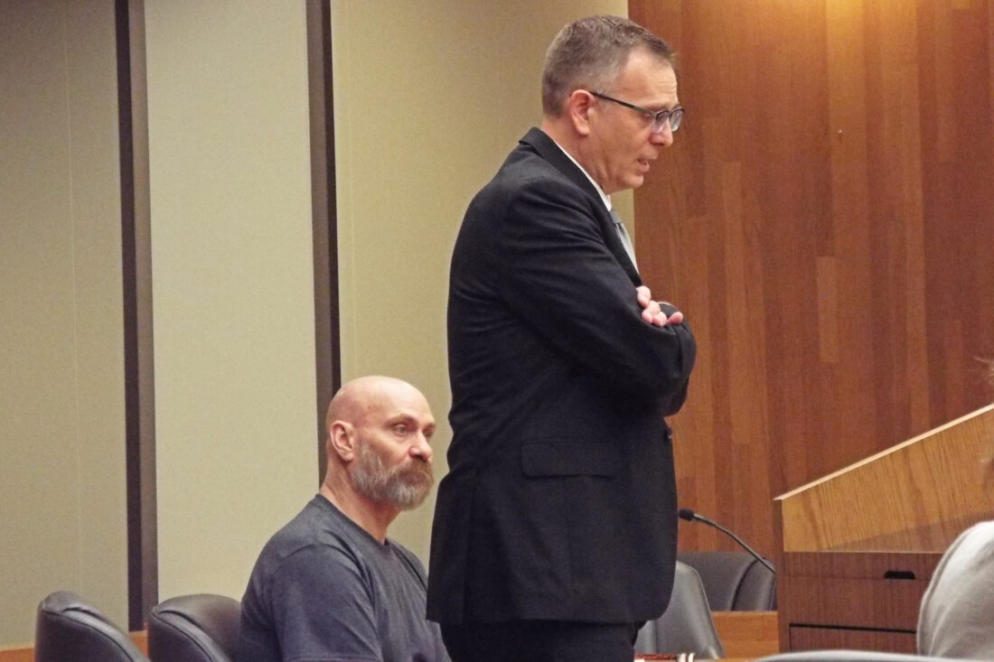 Rodney E. Marshall, left, and his attorney Cline Boone, right, at a hearing on June 30, 2023, in Douglas County District Court. Marshall is charged with two counts of murder in connection with the shooting deaths of two men and he is charged with multiple counts of attempted murder for allegedly shooting at police.