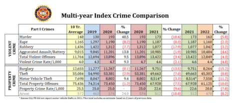 Violent crime in Kansas had been steadily rising each year since 2014, “but seems to have started to level off as violent crime offenses declined in 2021 and 2022,” the report noted. Despite this decline, the number of violent crimes in 2022 remained 9.2% above the 10-year average, and have not yet returned to pre-pandemic crime rates, the report said.