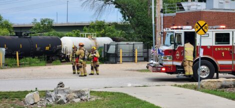 Emergency crews are pictured Thursday, July 13, 2023, on Powerhouse Road, where they were investigating a train car that was reportedly “off-gassing.”