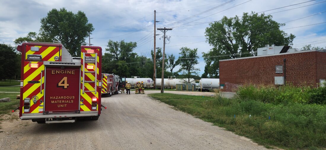 Crews were assembled on Powerhouse Road by the Kansas River Bridge, where a train was stopped and was “off-gassing” the substance. “Off-gassing” broadly refers to the airborne release of a chemical in gaseous form. A reporter on the scene noted an odor and a loud hissing coming from the train, and firefighters appeared to be periodically using a meter to test the air around the railcar.