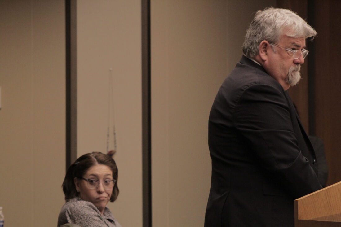 Starr Wayne Hart, left, and her defense attorney, Russell Powell, of Leawood, Kansas, during a jury trial on May 16, 2023, in Douglas County District Court. Hart was acquitted on one count of aggravated assault for pulling a gun on a man in the parking lot of a Baldwin City medical clinic.