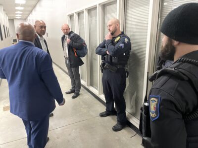 Lawrence Police Sgt. Justin Trowbridge, second from right, alerts Lawrence school district officials that officers are preparing to conduct a sweep of the building, in response to a bomb threat at district headquarters on Monday, Jan. 8, 2024.