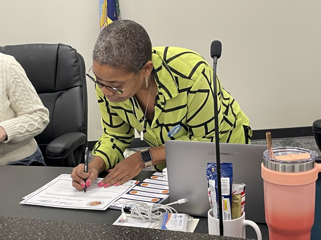 Newly-elected Lawrence school board member Yolanda Franklin signs paperwork after being sworn-in during Monday night’s board meeting.