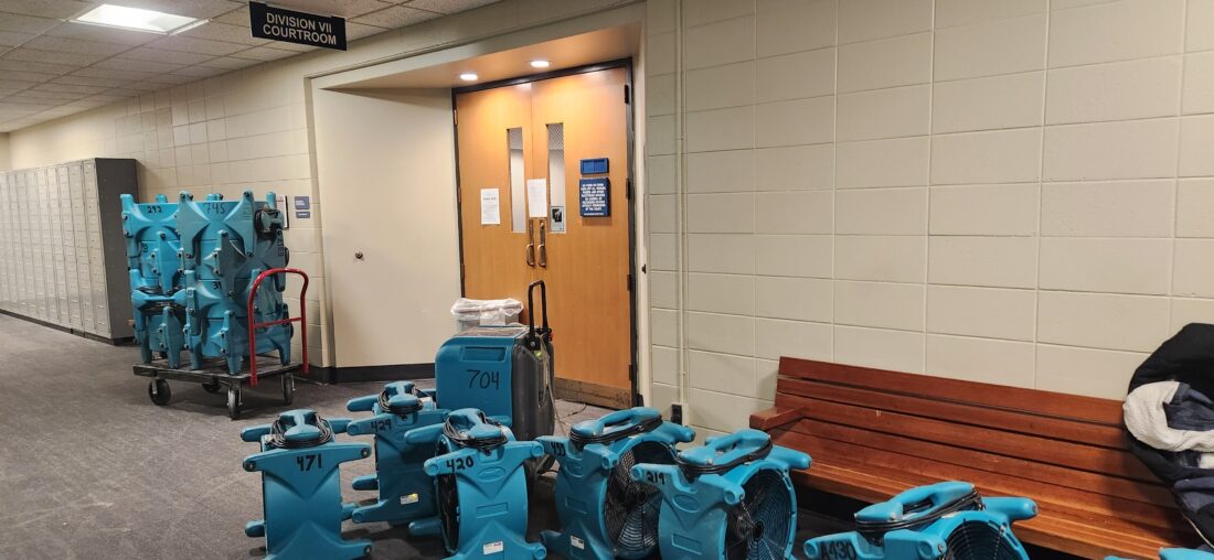Fans could be seen lining the hallway of the Division 7 courtroom at the Douglas County Judicial and Law Enforcement Center on Jan. 17, 2024, after a burst pipe flooded a jury room two days earlier.