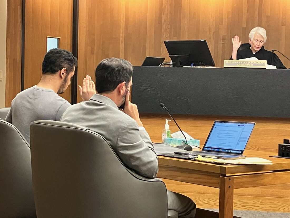 Judge Sally Pokorny accepts a guilty plea from Mateo Clavel Wills, left, on Friday, Aug. 22, 2025, in Douglas County District Court. Seated with Wills is his attorney, Hatem Chahine.
