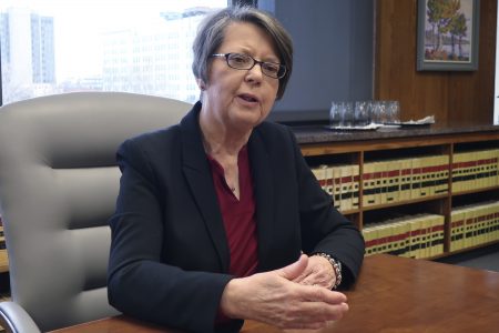 Kansas Supreme Court Chief Justice Marla Luckert answers questions during an interview with The Associated Press in the court's conference room Friday, Dec. 20, 2019, in Topeka. (AP Photo/John Hanna)
