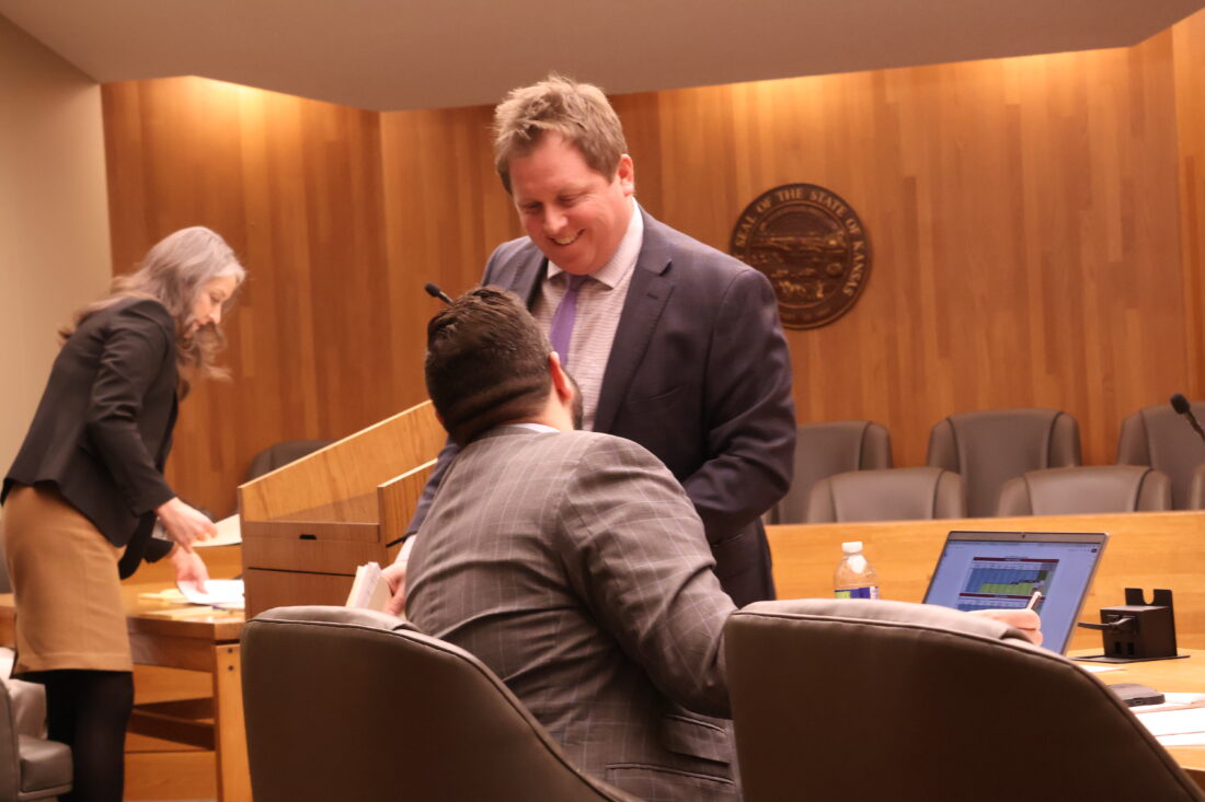 Attorney Jessica Glendening, left, DA Dakota Loomis, right, and Deputy DA David Greenwald, sitting, just after Loomis testified about his representation of a client on Feb. 20, 2025, in Douglas County District Court.