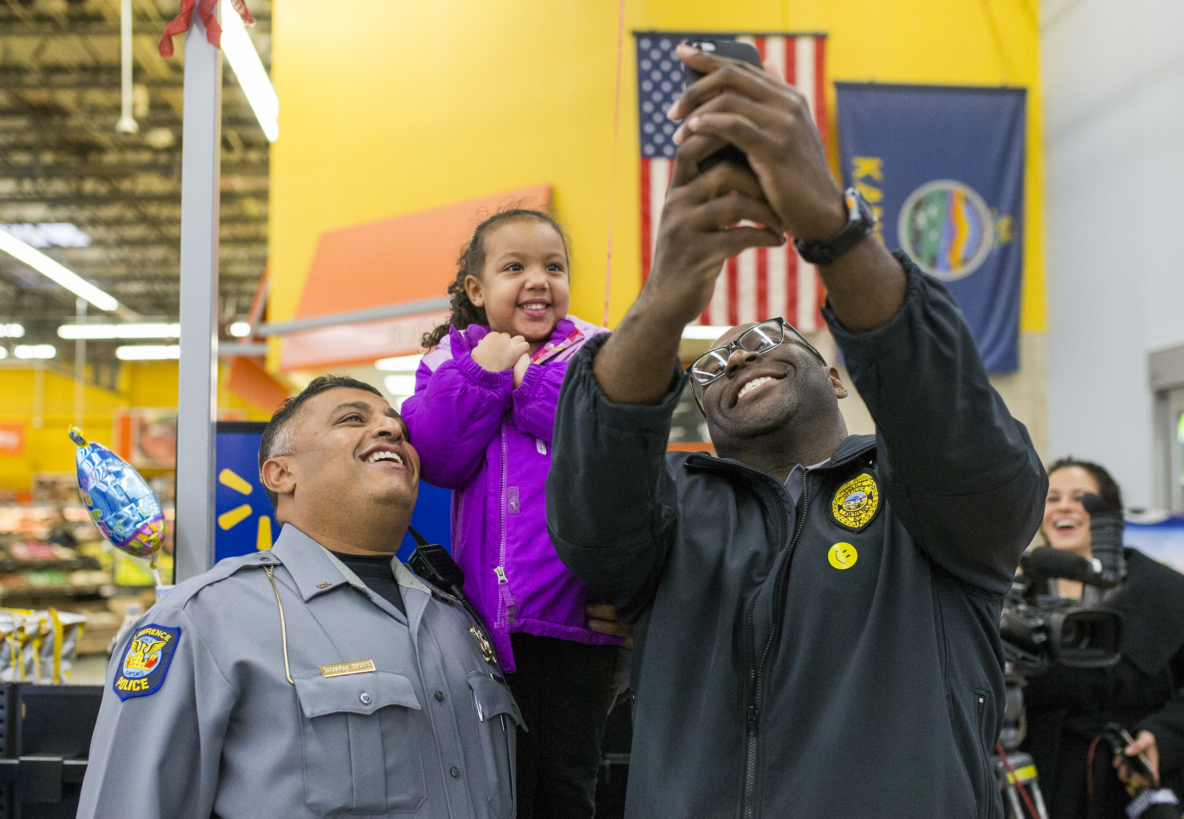 Lawrence Police detective Zach Thomas, left, and Sgt. Myrone Grady shoot a picture with 4-year-old Alonah after some holiday shopping at Wal-Mart, 550 Congressional Drive, during the annual TOYS (Take Our Youth Shopping) event on Friday, Dec. 16, 2016. Children from the Ballard Center were paired up with members of local law enforcement to shop for their families and themselves.