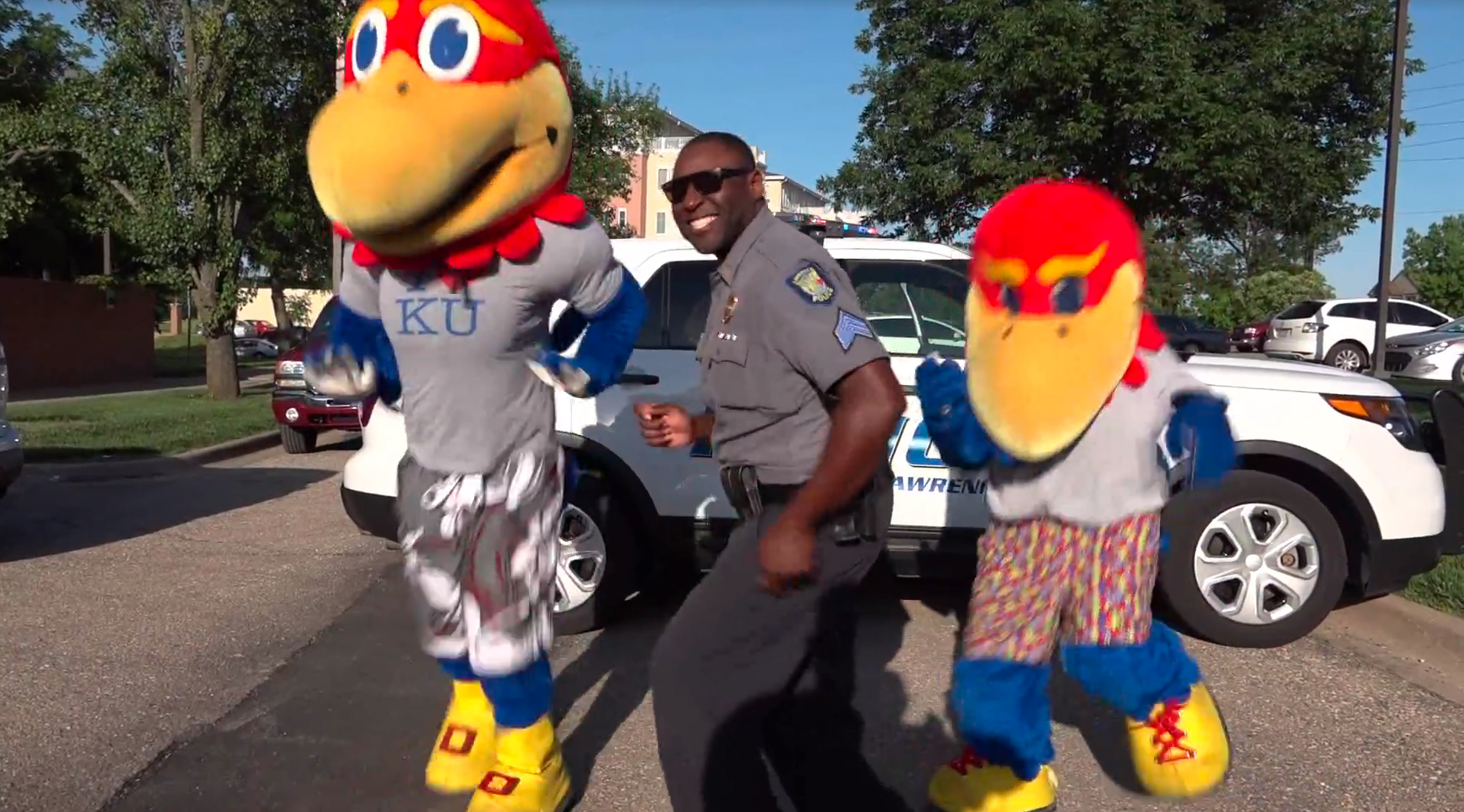 Lawrence Police Sgt. Myrone Grady dances with Kansas University’s Big Jay and Baby Jay in this screenshot from a video released by the department Friday, June 3, 2016, as part of the Running Man Challenge.
