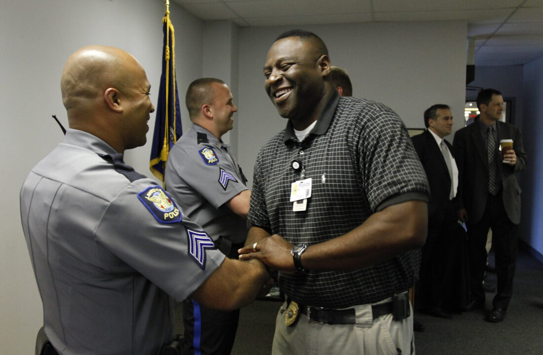 Lawrence Police Officer Myrone Grady, right, gives a congratulatory handshake to Anthony Brixius during a promotion ceremony in May of 2012.