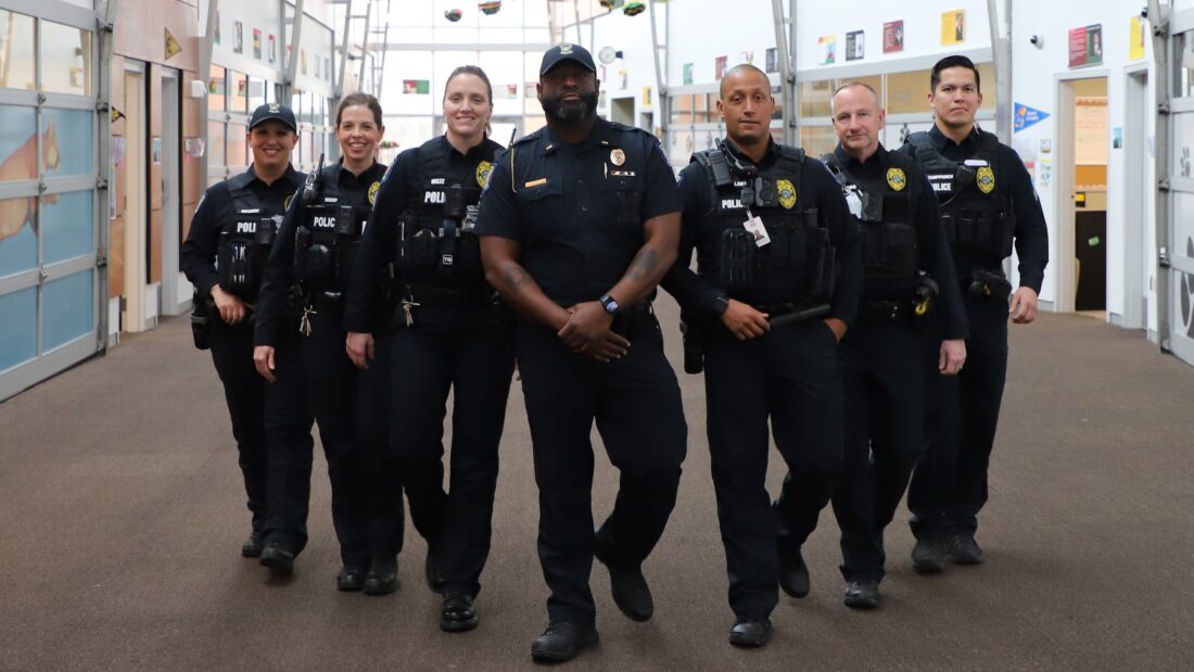 Members of Lawrence’s school resource officers program, pictured in June 2023, are, from left, Officer Bailey Salsbury, Southwest Middle School; Officer Lindsay Bishop, West Middle School; Corporal Kacey Wiltz, Free State High School; Lt. Myrone Grady, program supervisor and executive officer of Community Engagement and Diversity; Corporal Amaury Collado, Lawrence High School; Officer James Browning, Billy Mills Middle School; Corporal Dean Kemppainen, Liberty Memorial Central Middle School.