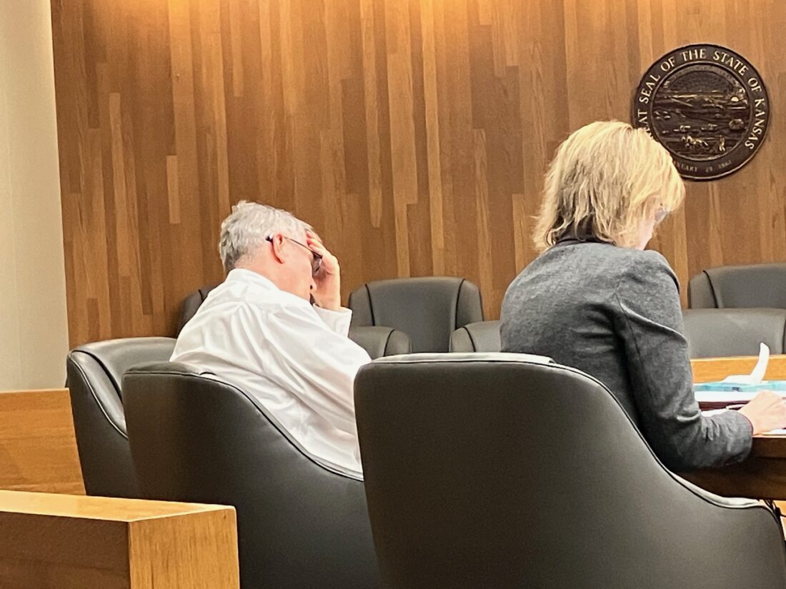 Mark Gridley is pictured with attorney Vanessa Riebli at his preliminary hearing Thursday, Oct. 2, 2025, in Douglas County District Court.