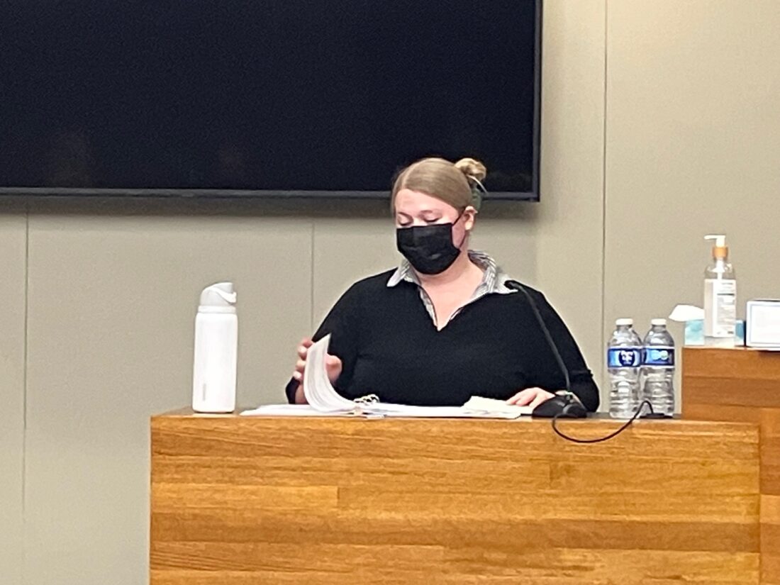 Billy Mills Middle School speech pathologist Kristi Toews testifies Friday, Oct. 3, 2025, at the preliminary hearing for Mark Gridley in Douglas County District Court.