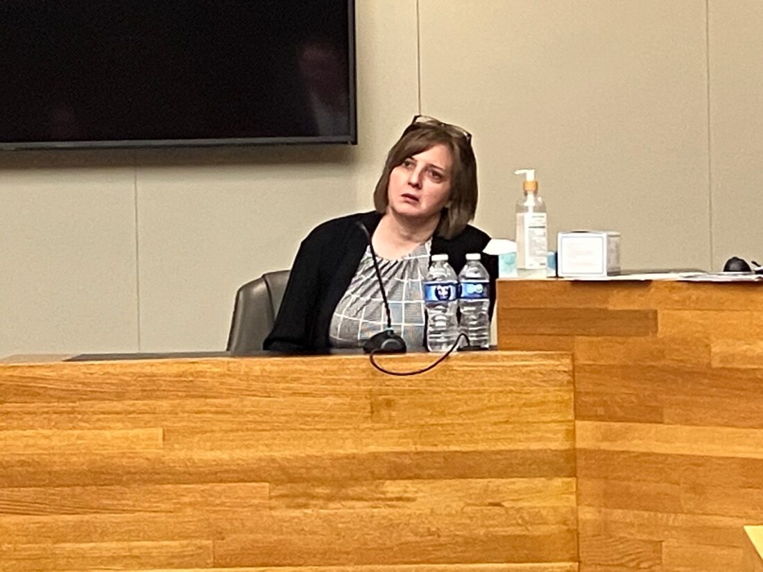 Forensic interviewer Shelby Deist of the Children’s Advocacy Center testifies Friday, Oct. 3, 2025, at the preliminary hearing for Mark Gridley in Douglas County District Court.