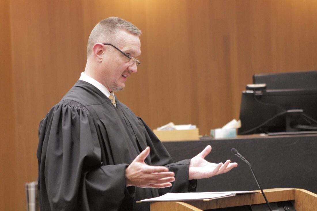 Chief Judge James McCabria speaks at a swearing-in ceremony for Judge Carl Folsom III on Dec. 2, 2022, at the Judicial and Law Enforcement Center.