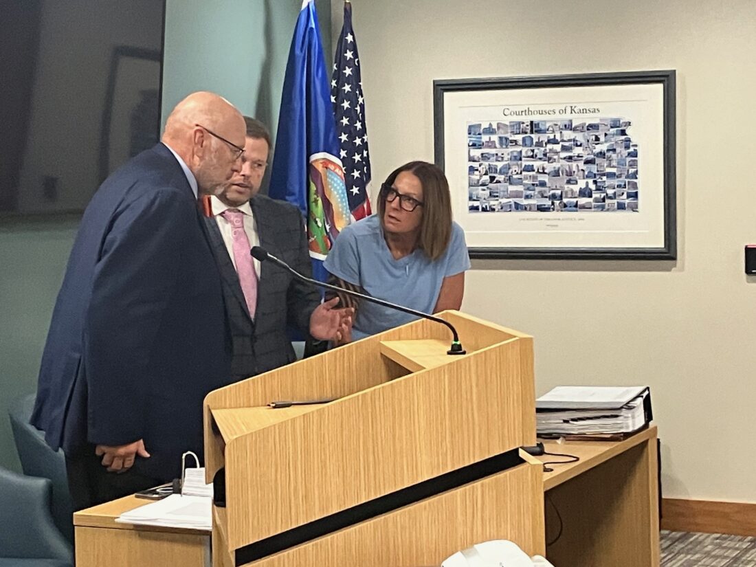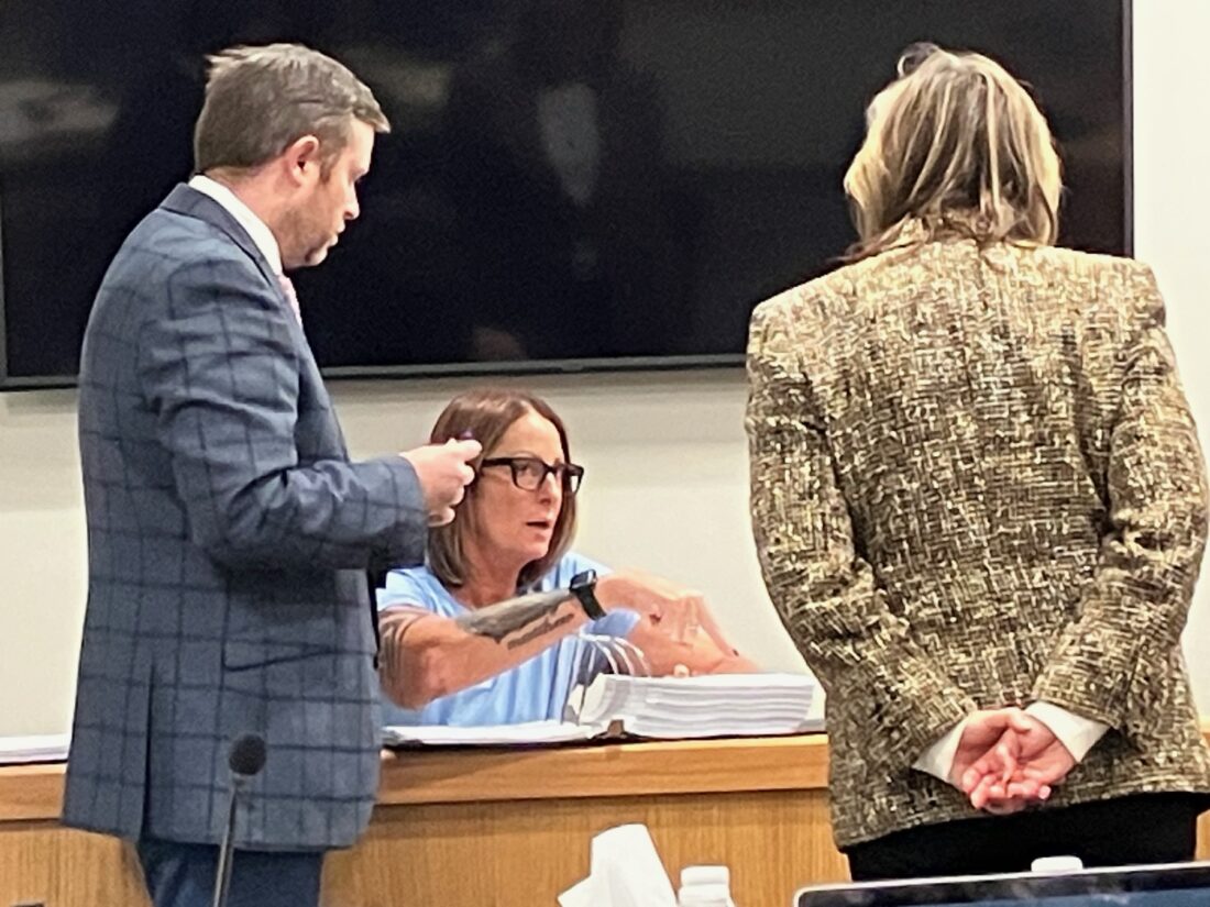 Carrody Buchhorn discusses the layout of a day care at her wrongful conviction trial Wednesday, Oct. 29, 2025, in Douglas County District Court. At left is her attorney, Quentin Templeton. Gay Tibbets, representing the State of Kansas, is at right.
