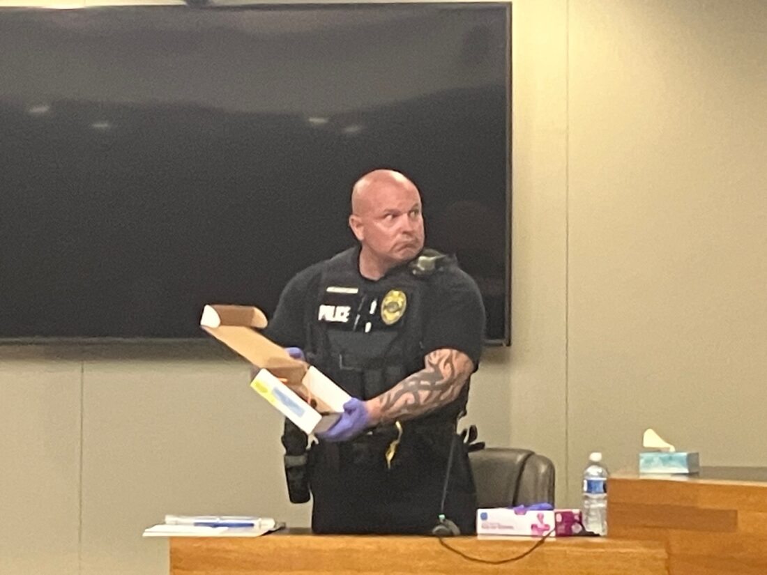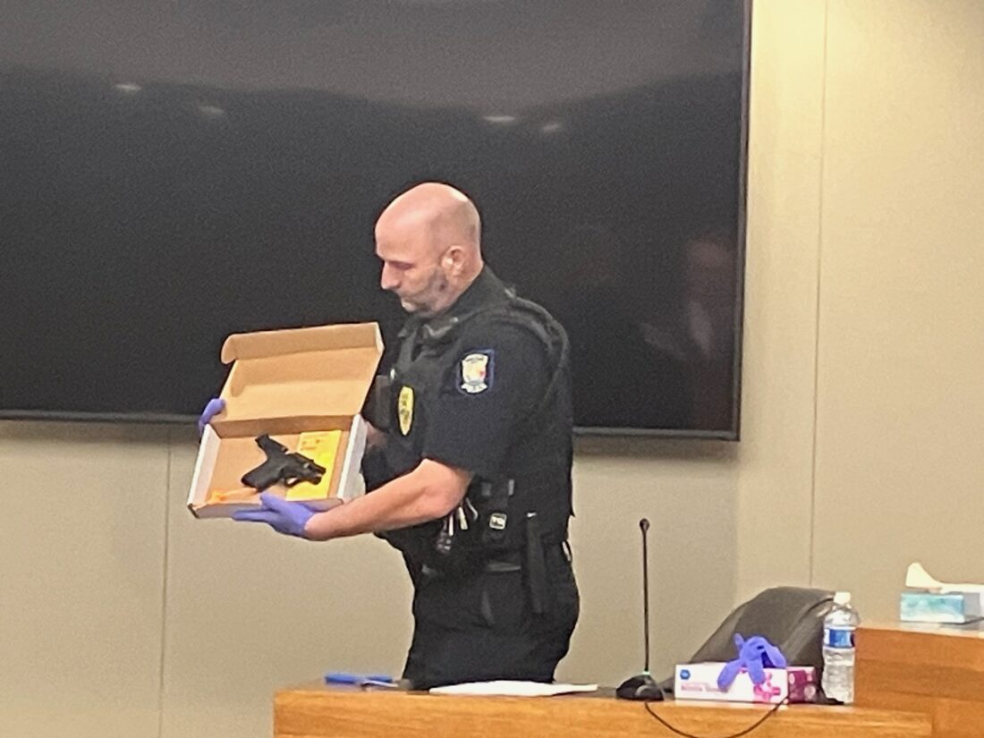 Lawrence Police Officer Kevin Henderson displays a semi-automatic handgun that reportedly was thrown from the vehicle of Rodney Marshall during a police pursuit in July 2022, Friday, April 3, 2026, in Douglas County District Court.