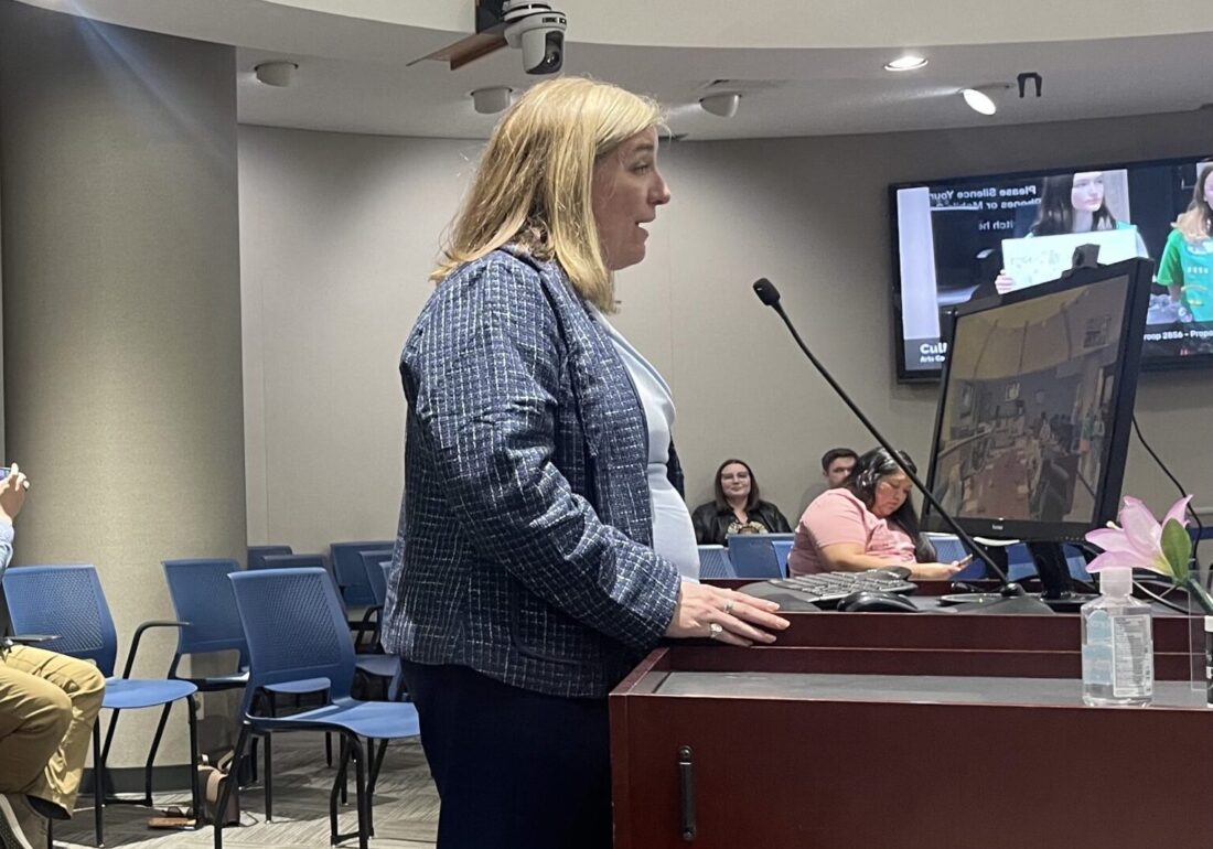 Lawrence attorney Meryl Carver-Allmond is pictured in April 2026 at a Lawrence City Commission meeting.