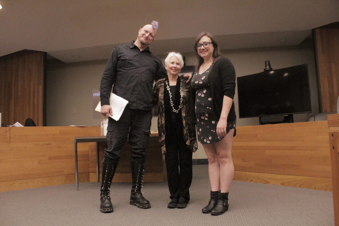 Judge Sally Pokorny sits on Van Go artist Langley Gottesburen’s bench at the Judicial and Law Enforcement Center on Thursday, Sept. 4, 2025. Gottesburen is at left, and Martha Hodge Smith, of the Douglas County Bar Association, is at right.