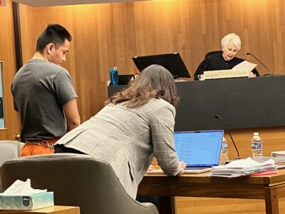 Tristan Aden James appears before Judge Sally Pokorny on Tuesday, Jan. 20, 2026, in Douglas County District Court. His attorney, Angela Keck, is to his right.